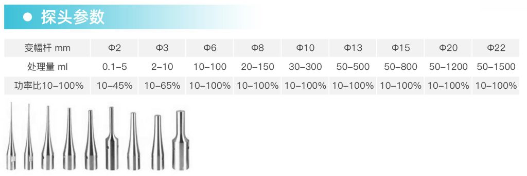 超聲探頭采用美標TC4材質的高純鈦合金,探頭形狀:錐形、鞭節形,發波形式:垂直超聲。